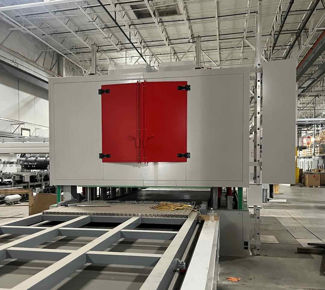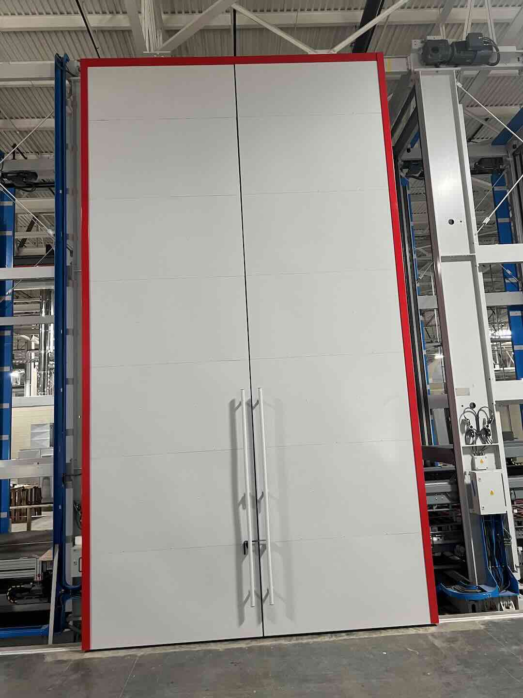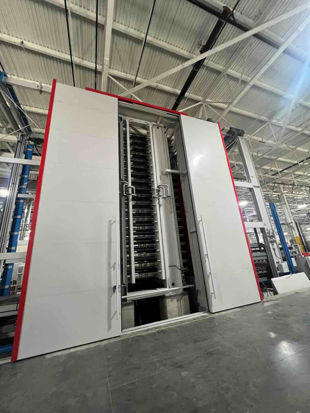 Sui due lati impianto invece sono state realizzate delle tapparelle a scorrimento verticale che permettono alla macchina l’introduzione e la rimozione delle lastre da trattare.